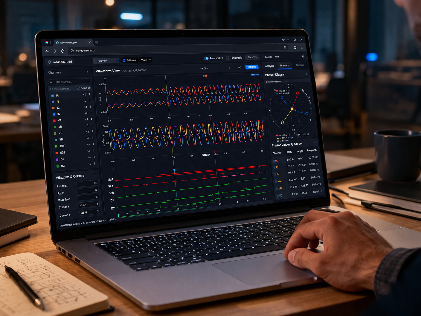 Use browser-based COMTRADE analysis to inspect event timing, current and voltage behavior, and phasor relationships during disturbance review.